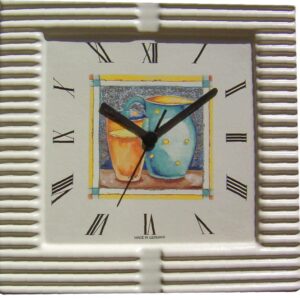 von 10 bis 30 cm großen Keramikuhren für alle Wohnbereiche, weiße oder in Farben, verschiedene Formen und Dekoren wie Blumen, Früchten, mit Gänsen- Vogel, Shiffs und Windrad Motiven, gedeckte Tisch, Vier Jahreszeiten, Delft Uhren. Ideale Geschenke!