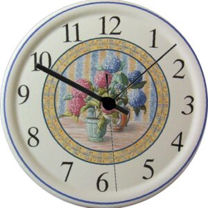 SKU: 150821Keramik Wanduhr (Motiv Blumenvase) Hortensien, Blaurand, Quarzuh